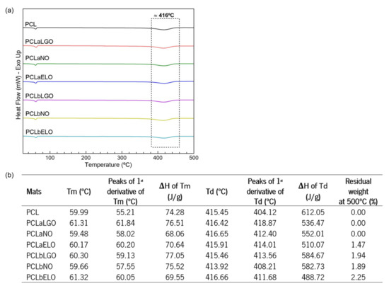 (a) DSC spectra of the PCL-based mats obtained from 25 to 500 °C under nitrogen atmosphere, flow rate of 200 mL/min and temperature rise of 10 °C/min. (b) Main DSC thermal transitions (Tm, melting temperature, Td, degradation temperature, and respective ΔH, enthalpy change) and TGA data (1st derivative temperature peaks, and residual weight at 500 °C), with n = 3 and S.D. < 1%.