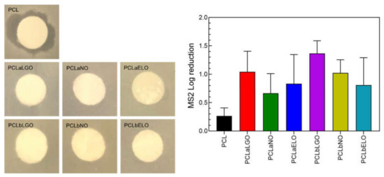 Bacteriophage solutions were prepared at 1 × 107 PFUs/mL in M271 and inoculated in the form of 50 µL loads (a volume defined to cover the entire surface without leaking to the exterior) on top of unloaded and EOs-loaded PCL mats of 1.1 cm in diameter. Samples were incubated for 4 h at RT (mimicking mask use conditions). In the end, mats were submerged in 5 mL of M271 and vortexed for 3 min for thorough washing of the surfaces and detachment of bacteriophage plaques. Finally, bacteriophage-containing suspensions (diluted from 101 to 105 in M271) were cultured on bacterium-seeded two-layer agar plates and incubated for 24 h at 37 °C. Grown plaques were counted and converted into log reduction (mean ± S.D.). For the purposes of eliminating the effect of the EOs on the host, equal experiments were conducted with E. coli. However, instead of washing and preparing diluted suspensions for plate culturing with M271, PBS was used.