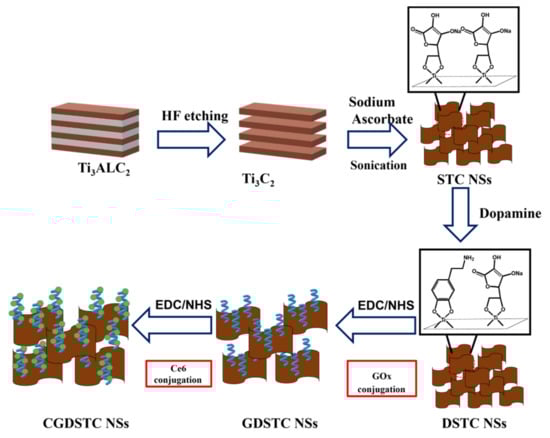 Titanium aluminum carbide (Ti3AlC2; 200 mesh) was obtained from 11 Technology (China). DA, GOx, Ce6, ethyl(dimethylaminopropyl)carbodiimide (EDC), WST-1, 9,10-dimethylanthracene (DMA), hydroxylamine (NH3O), triethylamine, D-(+)-Glucose, ethylenediaminetetraacetic acid (EDTA), minimum essential medium Eagle (MEM), Dulbecco’s modified Eagle’s medium with high glucose (DMEM), trypsin-EDTA solution (0.25%), L-glutamine solution, and antibiotic antimycotic solution were purchased from Sigma-Aldrich. SA was procured from Acros. Sulfo-NHS, trichloroacetic acid, and iron(III) chloride (FeCl3; 98%) were bought from Alfa Aesar. Fetal bovine serum (FBS) was obtained from Thermo Scientific HyClone (Logan, UT, USA). Titanium(IV) sulfate solution (Ti(SO4)2; 24%) was acquired from Kanto Chemical CO (Tokyo, Japan).