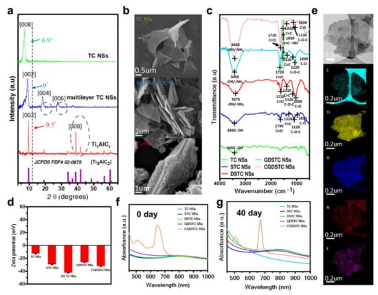 (a) XRD spectra and (b) SEM of Ti3AlC2, multilayer TC NSs, and TC NSs. (c) FT-IR spectra and (d) zeta potential measurements of TC NSs, STC NSs, DSTC NSs, GDSTC NSs, and CGDSTC NSs. (e) HRTEM and elemental mapping images (C, Ti, O, N, and F) of CGDSTC NSs. UV–Vis spectra of TC NSs, STC NSs, DSTC NSs, GDSTC NSs, and CGDSTC NSs (f) for 0 day storage and (g) after 40 days storage (stored at room temperature).