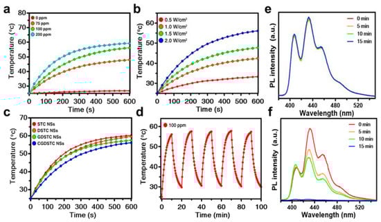 (a) Temperature elevation curves of CGDSTC NS solutions at different concentrations upon irradiation with 808 nm laser (2 W/cm2). Temperature elevation profiles of (b) CGDSTC NS solution (100 ppm) at different power densities of 808 nm laser and (c) STC NSs, DSTC NSs, GDSTC NSs, and CGDSTC NS solutions upon laser irradiation (808 nm, 2 W/cm2). (d) heating–cooling curves of CGDSTC NS solution (100 ppm) for five cycles of laser on/off (808 nm, 2 W/cm2). PL spectra of DMA with (e) GDSTC NSs and (f) CGDSTC NSs under 671 nm laser irradiation (0.5 W/cm2).