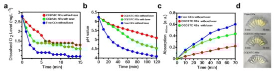 Time-dependent changes in (a) dissolved oxygen levels and (b) pH of glucose solution in the presence of free GOx, CGDSTC NSs, and CGDSTC NSs + laser. (c) Time-dependent changes in absorbance of fixed wavelength (λ = 405 nm) in the presence of free GOx, CGDSTC NSs, and CGDSTC NSs + laser (analysis of H2O2 production). (d) Photographs to show the time-dependent generation of H2O2 under free GOx, CGDSTC NSs, and CGDSTC NSs + laser.