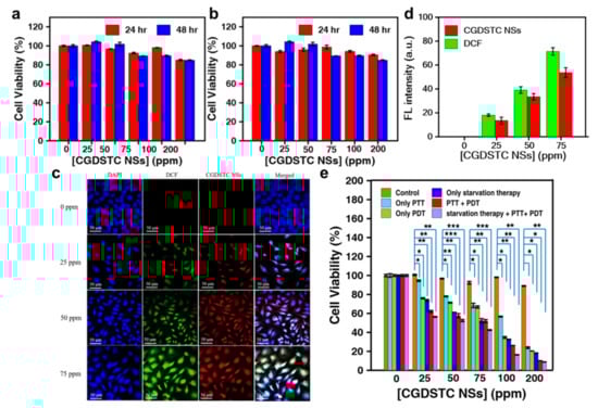 To verify the photothermal and photodynamic effect of NSs on cell death, HeLa cells were irradiated with 808 (2 W/cm2) and 671 (0.5 W/cm2) nm lasers, respectively, for 10 min after incubation with different concentrations of NSs for 24 h. For the combination effect of PTT and PDT, both lasers were applied on the cancer cells at the same time. As depicted in Figure 5e, laser irradiation alone did not induce any cell death. Nevertheless, the cell death was concentration-dependent in the presence of both CGDSTC NSs and laser, which could be attributed to the concentration-dependent photothermal and photodynamic properties of NSs. As the concentration of NSs increased, the percentage of viable cells in all treatments decreased, and it was significantly less in the PTT and PDT combination compared to that in PTT or PDT alone. For 200 ppm of CGDSTC NSs, PTT alone and PDT alone induced 76% and 79% cell death, respectively, whereas the combination of PTT and PDT induced 90% cell death.