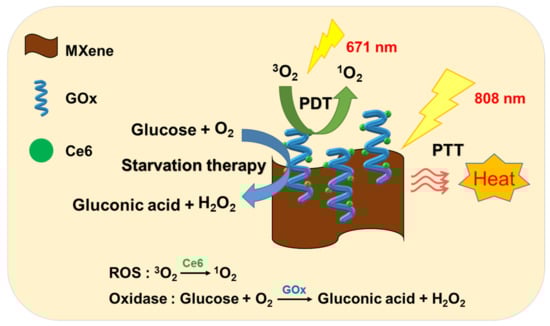 In this work, we used fluorescence (FL) imaging to develop MXene-based multifunctional theranostic nanosheets with photo and starvation therapeutic properties to attain high cancer therapeutic efficiency via the cooperative effect. We chose titanium carbide (Ti3C2) MXene as the PTA in this study. First, the stability of Ti3C2 MXene was enhanced through surface modification with the antioxidants SA and DA (DA/SA@Ti3C2 abbreviated as DSTC). SA and DA not only improved the stability of MXenes by arresting oxidation but also enabled functionalization with biological molecules. Then, GOx and Ce6 PS were sequentially attached onto the DSTC surface via simple carbodiimide coupling to empower it with GST and FL imaging and PDT properties, respectively (Ce6/GOx@SDTC abbreviated as CGDSTC). The working mechanism of CGDSTC NSs is shown in Scheme 1. Upon accumulation in glucose-rich tumor environments, the CGDSTC NSs could convert glucose into gluconic acid due to the presence of GOx and consequently sensitize the tumor cells to photothermal effects by constraining the tumor glycolytic pathway. Photo irradiation with 808 and 671 nm lasers led to destruction of tumor cells through Ti3C2- mediated PTT and Ce6-mediated PDT effects, respectively. Furthermore, laser irradiation with 808 nm laser augmented the efficiency of GST and PDT, with the higher temperature causing enhanced tumor oxygen levels and GOx catalytic activity. Moreover, the CGDSTC NSs allowed visualization of their localization into tumor cells due to FL imaging properties endowed by Ce6. Overall, high cancer-specific therapeutic efficiency was attained with our as-synthesized CGDSTC NSs via cooperative effect between starvation and phototherapy, which would effectually eliminate tumors in a more efficient and safer manner.