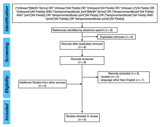 The PubMed database was analyzed with the following keywords: (“chitosan”[MeSH Terms] OR “chitosan”[All Fields] OR “chitosans”[All Fields] OR “chitosan s”[All Fields] OR “chitosane”[All Fields]) AND (“temporomandibular joint”[MeSH Terms] OR (“temporomandibular”[All Fields] AND “joint”[All Fields]) OR “temporomandibular joint”[All Fields] OR (“temporomandibular”[All Fields] AND “joints”[All Fields]) OR “temporomandibular joints”[All Fields]). After screening 8 results, 5 studies were included in this review.