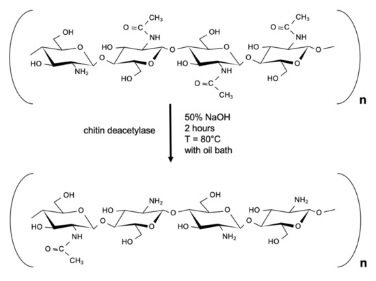 Chitosan is a polycationic linear polysaccharide composed of varying amounts of deacetylated β-(1–4)glucosamine (GlcN) and acetylated N-acetyl-glucosamine (GlcNAc) residues [42,43]. It is obtained from chitin in a deacetylation process with chitin deacetylase (of bacterial or fungal origin) or in an alkaline hydrolysis [40,44,45]. Figure 3 presents the reaction of chitin deacetylation.