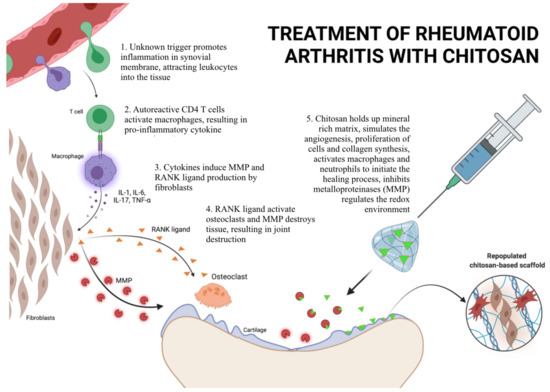 Figure 5 presents the exemplary mechanism of treatment of rheumatoid arthritis (RA) with chitosan. Inflammation of the synovial membrane within the joint is initiated by an unknown trigger. Autoreactive lymphocytes and macrophages are attracted to the inflamed tissue. Next, autoreactive CD4 T cells activate macrophages, which results in the production of proinflammatory cytokines. Proinflammatory cytokines activate fibroblasts to produce MMPs. The tumor necrosis factor (TNF) family cytokine receptor activator for nuclear factor κ B ligand (RANK ligand) is the primary activator of bone-destroying osteoclasts. Intraarticular injection of chitosan promotes cartilage formation, inhibits MMPs, regulates the redox environment, stimulates angiogenesis, and initiates the healing processes [83].
