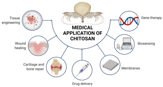 Medical application of chitosan based on the literature [74,75,76,77,78,79,80,81,82,83,84,85,86,87,88,89,90,91,92,93,94,95,96,97,98,99,100,101]. Figure 6 was created with BioRender.com. (accessed on 17 December 2021.).