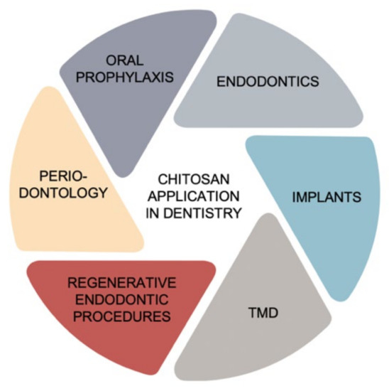 Application of chitosan in dentistry based on the literature [102,103,104,105,106,107,108,109,110,111,112,113,114,115,116]. TMDs: temporomandibular joint disorders.