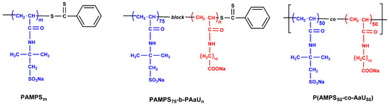 Homopolymers PAMPSm (m = 40, 75 and 170) and a series of diblock PAMPS75-b-PAaUn copolymers (n = 3, 12, 28, and 39, respectively) were synthesized via RAFT polymerization. The random copolymer P(AMPS50-co-AaU50) was obtained in free radical polymerization. The polymer compositions were confirmed by 1H NMR (Supplementary Materials, Figures S1–S3). The structures of these polymers are presented in Figure 1 and their characteristics are shown in Table 1.