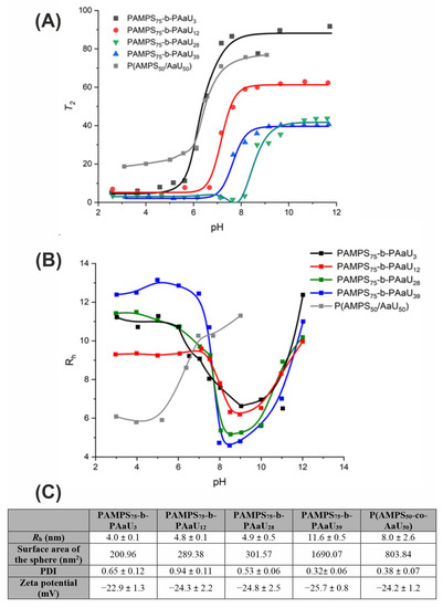 All the polymers studied are well-soluble in water; however, due to their amphiphilic nature, they self-assemble in aqueous media with the formation of the core-shell micelles. The process is dependent on a pH of a solution and can be monitored by the analysis of the motion of polymer chains. 1H NMR spin-spin relaxation time (T2) was measured as a function of pH. Figure 2A shows T2 at 1.25 ppm, attributed to the pendant methylene protons in the PAaU block as a function of pH. At acidic conditions, T2 decreased due to the formation of a hydrophobic core of polymer micelles which restricted motions of the PAaU block.