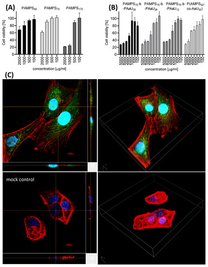 PAMPS-PAaU copolymers are not toxic towards Vero cells. Cytotoxicity of PAMPSm homopolymers (A), PAMPS75-b-PAaUn and P(AMPS50-co-AaU50) (B) copolymers of various M.W.s at 2000, 1000, 500 and 100 µg/mL. Results of XTT assay of the tested polymers on Vero cells. All experiments were performed in triplicate. Average values with standard error of the mean (error bars) are presented. (C) Three-dimensional fluorescent images of Vero cells incubated with 50 µg/mL of PAMPS75-b-PAaU28-b-F for 1 h. Cell nuclei are denoted in blue, actin is denoted in red and fluorescent polymer is green.