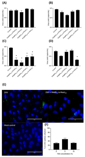 To study if polymer hampers ZIKV attachment to host cells, Vero cells were seeded on coverslips mounted in 12-well plates (TPP, Trasadingen, Switzerland) to achieve 90% confluency. Cell were pre-cooled to 4 °C and incubated with a mixture of virus stock and 50 µg/mL PAMPS75-b-PAaU39 in medium containing 0, 5 or 10% (250 µL) final concentration of FBS for 1 h at 4 °C. After incubation, cells were immediately fixed and immunostained.