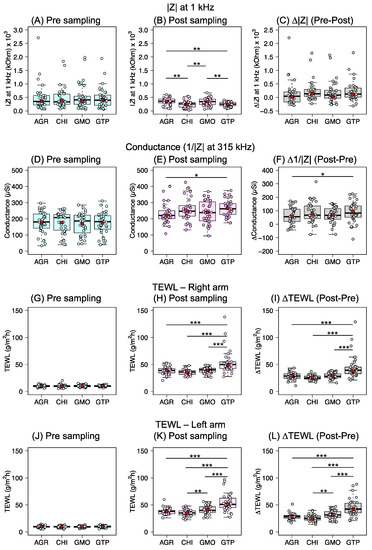 Comparison between pre- (left panel, (A,D,G,J)) and post- (middle panel, (B,E,H,K)) skin barrier biophysical data obtained at skin sites grouped according to sampling formulations, including the difference between corresponding pre- and post-data (right panel, (C,F,I,L)). Skin resistance values represent |Z| at 1 kHz, and conductance values represent 1/|Z| at 315 kHz. The significance levels used were: * p < 0.05, ** p < 0.01, *** p < 0.001. See Table S4 for a compilation of p-values derived from a statistical analysis of the data presented in this figure (one-way ANOVA with multiple testing, Tukey test).