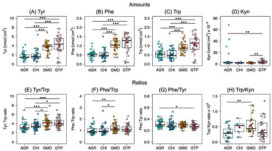 Comparison of the capacity of AGR, CHI, GMO, and GTP to collect Tyr (A), Phe (B), Trp (C), and Kyn (D) from the skin surface of healthy volunteers. Ratios between collected amounts of Tyr/Trp (E), Phe/Trp (F), Phe/Tyr (G), and Trp/Kyn (H). The significance levels used were: * p < 0.05, ** p < 0.01, *** p < 0.001. See Table S7 for a compilation of p-values derived from a statistical analysis of the data presented in this figure (one-way ANOVA with multiple testing, Tukey test).