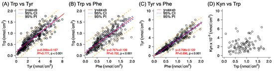Correlation plots (A–D) between the collected amounts of analytes from individual skin sampling sites. The plots include regression line, the 95% confidence interval (95% CI), and the prediction interval (95% PI). In case of Kyn vs. Trp (D), the R2 was 0.033 and p = 0.080. Number of data points: n = 277 for Tyr, n = 274 for Phe, n = 277 for Trp, and n = 93 for Kyn.