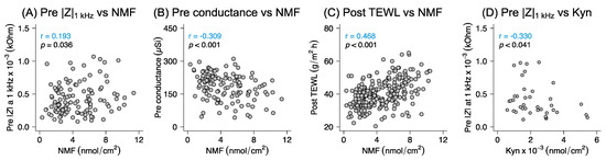 Starting with the correlations based on the data from all sampling formulations combined, a weak positive correlation was found between the NMF quantities and the initial skin resistance values (Figure 5A), while a weak negative correlation was observed between the NMF quantities and the initial conductance measurements (Figure 5B). Moreover, a weak positive correlation was found between the collected NMF quantities and the post-sampling TEWL (Figure 5C). No other significant correlations were observed between the NMF quantities and the skin barrier measurements, neither pre- nor post-sampling (Figure S10A). Interestingly, in the case of Kyn, a weak negative correlation was observed between the initial skin resistance values and the collected amounts of this molecule from all formulations combined (Figure 5D). However, considering that the collected amounts of Kyn were detected below the LOQ, this result must be confirmed by future studies with more accurate and precise analytical methods for Kyn quantification.