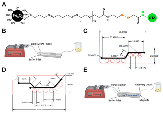 (A) Schematic of the synthesized nanoconjugate for the MLPs production. (B) Microfluidic experimental setup for the synthesis phase. Microfluidic separation designs proposed: (C) System 1 and (D) System 2. (E) Microfluidic experimental setup for the separation phase.