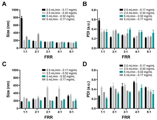 Figure 2A,B shows the size and PDI of the synthesized MLPs using the two-layer device. In this case, no apparent differences in size were identified for the evaluated TFRs and the concentration of the nanoconjugates used in the experiment for different FRRs. Nevertheless, there is a slight decrease in size with the increase of the FRR in almost all cases except for the TFR of 5 mL/min at a concentration of nanoconjugates of 0.17 mg/mL for the 1:1 to the 2:1 FRR, where it is comparable with the results for the synthesis of liposomes for different FRRs [31,41]. Additionally, the size of the MLPs synthesized is smaller than 400 nm except for the case where the TFR, concentration, and FRR are the lowest. The PDI of the synthesized MLPs presented values under 0.5 in almost all cases, which indicates that the MLPs samples obtained had acceptable polydispersity.