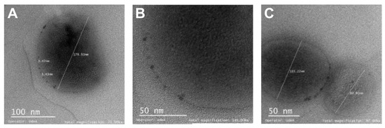Magnetoliposome size and polydispersity index were measured using the Zetasizer Nano ZS (Malvern, Panalytical, Egham, UK). Additionally, a morphology and size characterization using a TEM Tecnai F20 Super Twin TMP (FEI, Hillsboro, OR, USA) was performed to determine the synthesis effectiveness. For the TEM analysis, a sample drop was deposited on a copper grid with a carbon coating that was dried for 1 h. Next, the prepared sample was stained with 2% uranyl acetate by depositing one drop on the grid for 8 min, washed with deionized water, and left to dry for imaging at a total magnification of 71, 97, and 145 kX.