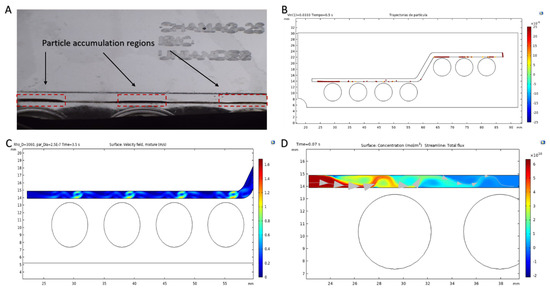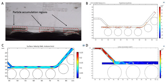 Qualitative results of the separation System 1. (A) Zoom of nanoconjugates accumulation regions inside the magnetophoretic microfluidic channel. (B) Particle trajectories in the magnetophoretic separation channel (nanoconjugates are shown in yellow and MLPs in red). (C) Velocity profile of the mixture. (D) Concentration profile in the microchannel.