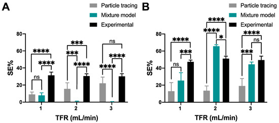 Microfluidic separation efficiency for Systems 1 and 2. (A) Comparison of both simulation approaches and the experimental results obtained for System 1 with a TFR ranging from 1 to 3 mL/min. (B) Comparison of both simulation approaches and the experimental results obtained for System 2 with a TFR ranging from 1 to 3 mL/min. Results with a p-value ≤ 0.05 (*) were considered significant. (*) corresponds to statistically significant difference with a p-value between 0.01 and 0.05; (***): 0.0001 ≤ p-value ≤ 0.001; (****): p-value < 0.0001; “ns” represents no statistically significant differences between the treatments.