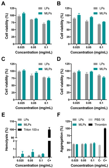 Biocompatibility assays for MLPs and LPs. Viability of Vero cells after 24 (A) and 48 h (B) of exposure. Viability of AGS cells after 24 (C) and 48 h (D) of exposure. (E) Hemolysis of MLPs and LPs with Triton X-100 as the positive control and PBS 1× as the negative control. (F) Platelet aggregation of MLPs and LPs with PBS 1× as the negative control and thrombin as the positive one.