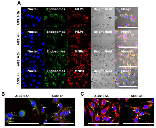 (A) Cell internalization and endosomal escape for magnetoliposomes and MNP-PEG-AEDP-CTA-RdB nanoconjugates (MNPs) in AGS cells with 40× magnification after 0.5 h and 4 h of exposure. The scale bar corresponds to 100 µm. AGS cells with 60× magnification and digital zoom to 120× after 0.5 h and 4 h of exposure to MLPs (B) and nanoconjugates (MNPs). (C). The scale bar for both (B,C) corresponds to 50 µm. The yellow arrows indicate colocalization between the green and the red channels, showing nanoparticles encapsulated into endosomes. The white arrows indicate non-colocalized zones, displaying nanoparticles that escaped endosomes or reached the intracellular space by a different internalization mechanism.