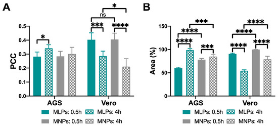 Pearson correlation coefficient (PCC) and percentage of area covered by the nanoconjugates in Vero and AGS cells. Higher PCC values indicate a higher amount of nanoconjugates trapped in endosomes. (A) PCC of MLPs and nanoconjugates in Vero and AGS cells for 0.5 h and 4 h. (B) Area covered by the MLPs and nanoconjugates in Vero and AGS cells for 0.5 h and 4 h. Results with a p-value ≤ 0.05 (*) were considered significant. (*) corresponds to statistically significant difference with a p-value between 0.01 and 0.05; (***): 0.0001 ≤ p-value ≤ 0.001; (****): p-value < 0.0001; “ns” represents no statistically significant differences between the treatments.