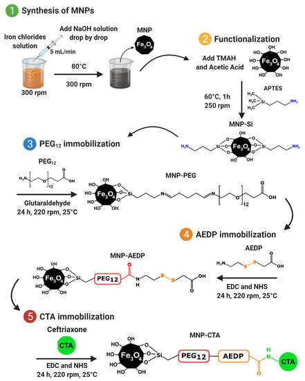 Magnetite nanoparticles (MNPs) were synthesized by the chemical co-precipitation method. For this, FeCl2 (0.34 g, J. T. Baker, Phillipsburg, NJ, USA) and FeCl3 (0.93 g, Merck, Kenilworth, NJ, USA) were solubilized in 60 mL of type I water. In addition, 0.69 g of NaOH (PanReac AppliChem, Darmstadt, Germany) was added to 17 mL of type I water, and then both solutions were heated at 80 °C. Next, a NaOH solution was added dropwise to the iron chloride solution at a 5 mL/min rate under constant stirring. A black precipitate was observed, corresponding to the formation of MNPs. The obtained MNPs were then washed four times with NaCl solution (1.5% w/v) and twice with type I water aided by a neodymium magnet. Then, 100 mg of MNPs were silanized by adding 50 µL of glacial acetic acid (PanReac AppliChem, Barcelona, Spain) followed by 400 µL of (3-aminopropyl) triethoxysilane (APTES, 98%, Sigma-Aldrich, St. Louis, MO, USA). The MNPs solution was left to react under constant stirring (250 rpm) at 60 °C for 1 h and then washed as mentioned previously. Later, 100 mg of the silanized MNPs (MNP-APTES) was mixed with 2 mL of glutaraldehyde solution (2% v/v, Sigma-Aldrich, St. Louis, MO, USA) (solution previously stirred (220 rpm) at room temperature for 1 h to allow glutaraldehyde activation (MNP-APTES-GA)). Then, 5 mL of a NH2-PEG-propionic acid (99%, Merck, Darmstadt, Germany) solution (2 mg/mL) was added dropwise to the MNP-APTES-GA conjugates under constant stirring to obtain MNP-APTES-PEG conjugates. The solution was left to react at 220 rpm and room temperature for 24 h and washed four times with NaCl solution (1.5% w/v) and twice with type I water. Similarly, (3-[(2-aminoethyl)dithio]propionic acid) (AEDP, ThermoFisher, Waltham, MA, USA) immobilization was carried out using 14 mg of N-[3-dimethylammino)-propyl]-N′-ethyl carbodiimide hydrochloride (EDC, 98%, Sigma-Aldrich, St. Louis, MO, USA) and 7 mg of N-hydroxy succinimide (NHS, 98%, Sigma-Aldrich, St. Louis, MO, USA) solution in 5 mL of type I water added to 100 mg of MNP-PEG in 50 mL of type I water to activate the terminal carboxyl groups. Nanoparticles were ultrasonicated (ultrasonic bath, Branson, Danbury, CT, USA) for 10 min, and 5 mL of an AEDP solution (5 mg/mL) was added dropwise under constant stirring. The solution was left to react at 220 rpm and room temperature for 24 h. The MNP-PEG-AEDP conjugates were washed with NaCl (1.5% w/v) and type I water. Finally, the antibiotic CefTRIAxone (CTA, Vitalis, 1 g I.M/I.V) was immobilized by following the same protocol for AEDP immobilization, using 5 mL of CefTRIAxone solution (2 mg/mL). Scheme 1 shows the complete methodology for the synthesis.