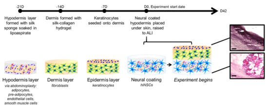 - Zhang, Q.; Wen, J.; Liu, C.; Ma, C.; Bai, F.; Leng, X.; Chen, Z.; Xie, Z.; Mi, J.; Wu, X. Early-stage bilayer tissue-engineered skin substitute formed by adult skin progenitor cells produces an improved skin structure in vivo. Stem Cell Res. Ther. 2020, 11, 407. [Google Scholar] [CrossRef] [PubMed]