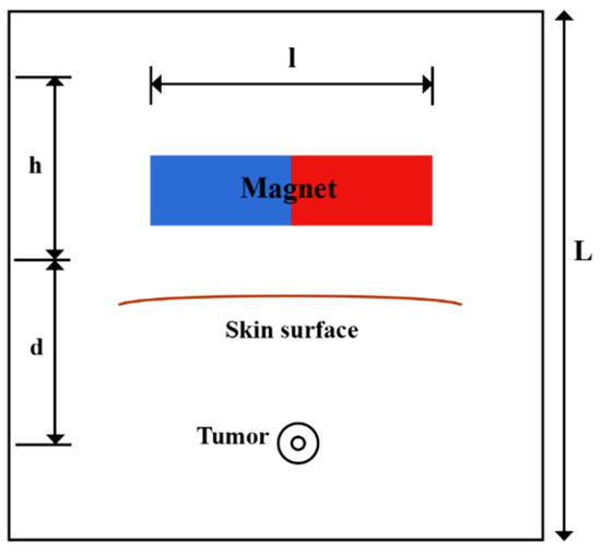 A solid tumor may have a necrotic area that lacks functional blood or lymph vessels; thus, there is no exchange of fluid with the interstitium in this region. In contrast, the regions of the tumor that are outside of the necrotic core contain rapidly dividing cells and blood vessels. In order to consider this non-uniform perfusion rate in the tumor, a biologically related structure, including an area with a necrotic core and a surrounding with leaky vasculature, is defined as a tumor [49]. A representation of the model’s geometry is presented in Figure 2. A magnet with length, l, and width, h, lies at a distance, d, from the tumor. A circular tumor with radius, R, and a necrotic core with radius, Rn, were considered. Doxorubicin has been used as one of the most widely used drugs in the model.