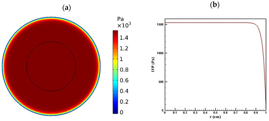 IFP distribution in a tumor with a radius of 10 mm: (a) contour of IFP distribution in the tumor; (b) IFP distribution values along the tumor radius.