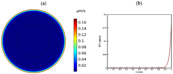 IFV distribution in a tumor with a radius of 10 mm: (a) contour of IFV distribution in the tumor; (b) IFV distribution values along the tumor radius.