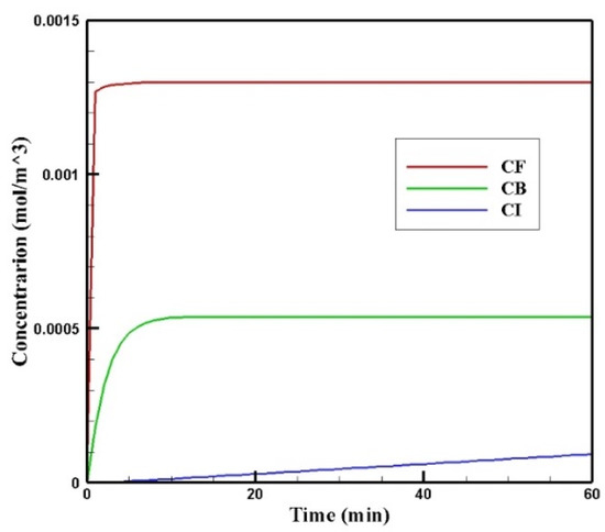 In this section, we examine the results of drug transfer by conventional IP chemotherapy. The spatiotemporal distribution of the free drug (CF), bound drug (CB), and drugs internalized into cancer cells (CI) were examined in the tumor during one hour of chemotherapy. Two main criteria were considered for the evaluation of the performance of chemotherapy with this method: