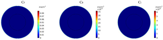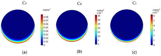 In Figure 9, the mean concentrations of the free, bound, and internalized drugs are presented over 60 min of treatment. At the end of the treatment, CF, CB, and CI were calculated to be 0.0054, 0.0022, and 0.00025, respectively. Compared to the corresponding values for conventional IPC (i.e., 0.0012, 0.0005, and 0.009), an increase of 4.5, 4.4, and 2.77 times in the mean concentration of the free, bound, and internalized drug were achieved, respectively. Contours of CF, CB, and CI are shown in Figure 10a–c. Comparison of these contours with the contours of conventional IPC in Figure 7 shows that the drug distribution became much better in all of its three forms using MNPs. In traditional intraperitoneal drug delivery, the drug penetrates the outer border of the tumor uniformly from all radial directions. But in drug delivery using a magnet, the magnetic force determines the area where the drug enters the tumor. In the case we simulated here, the direction of the magnetic force was upward. Thus, in the lower area of the tumor, the magnetic force pushed the drug into the tumor tissue, while in the upper area of the tumor, it the opposite effect and impeded the drug from penetrating the tumor.