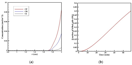 (a) Diagram of the mean concentrations of free (CF), bound (CB), and internalized drug (CI) after 60 min; (b) killed cells fraction (FK) during 60 min of chemotherapy with intraperitoneal injection.