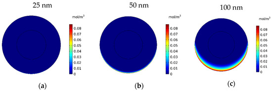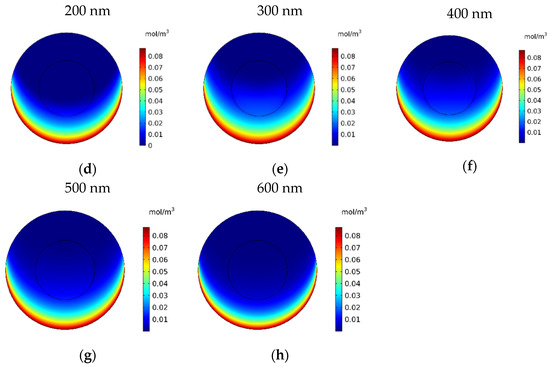 In this section, the impact of the size of the MNPs used in magnetically controlled IP chemotherapy was studied. Eight different nanoparticles with radii in the range of 25–600 nm were studied. In Figure 12a–h, contours of the free drug concentration distribution are shown for radius ranges of 25, 50, 100, 200, 300, 400, 500, and 600 nm. These contours indicate that magnetic nanoparticles with radii of 25 and 50 nm have poor penetration into the tumor, while increasing the size of nanoparticles to 100 nm significantly increased the penetration of the drug from the lower part of the tumor. Increasing the radius of the nanoparticles to a value greater than 100 nm will dramatically improve the penetration of the drug into the tumor.