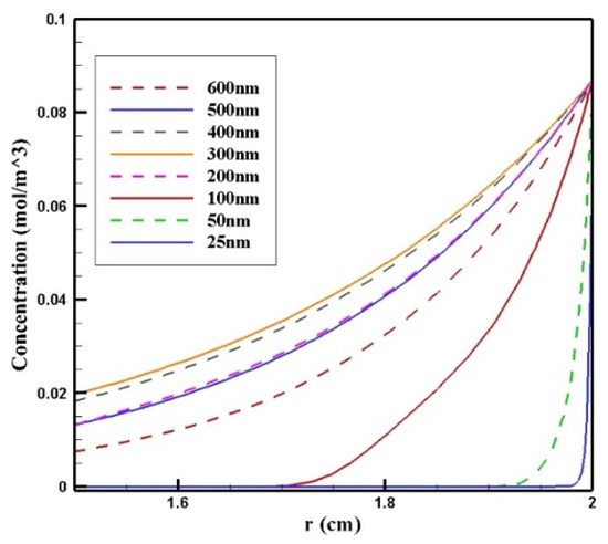 In Figure 14, CF distribution along the vertical line of the tumor is presented. Drug delivery using nanoparticles with a radius of 300 and 400 nm resulted in deeper penetration of the drug into the tumor and, subsequently, it increased CF in the tumor. However, 25 and 50 nm particles showed poor drug penetration into the tumor.