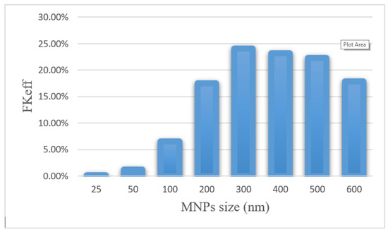 Efficacy parameters w1/2, PArel, FKPA, and FKeff are reported in Table 6. There was an increase in w1/2 values from 0.003 cm for 25 nm particles to 0.235 cm for 300 nm particles. As the nanoparticle size further increased, w1/2 decreased, until it reached 0.143 for 600 nm particles. The smallest PArel among the compared nanoparticles was related to 25 nm nanoparticles (0.20%), and 300 nm nanoparticles with 55.02% had the largest PArel among the studied MNPs. FKeff values for different sizes of MNPs after 60 min of treatment are presented in Figure 15. FKeff was calculated as the lowest value for 25 nm nanoparticles, which was equal to 0.11%, whereas it was the highest for 300 nm particles with 24.1%.