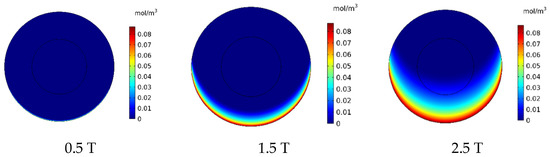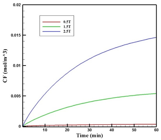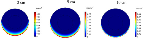 Figure 20 shows the contours of CF in the tumor for three different distances of the permanent magnet from the tumor including 3, 5, and 10 cm. The comparison of the contours shows that by increasing the distance, a smaller part of the tumor was affected by the drug. This reduction in penetration occurred dramatically, especially by increasing the distance of the magnet from the tumor to 10 cm. According to Figure 21, CF values 60 min after the injection at a distance of 3 cm was 0.0069 mol/m3, while increasing the distance to 10 cm decreased the CF value to 0.0019 mol/m3.