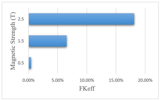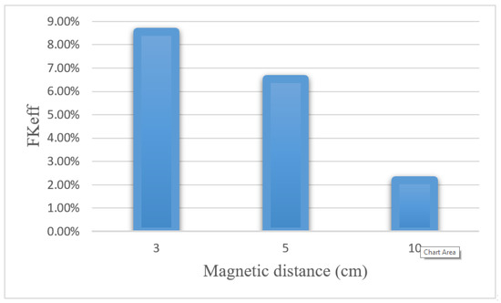 Table 8 presents the values obtained for w1/2, PArel, FKPA, and FKeff for three distances between the magnet and the tumor after 60 min of treatment. Reducing the distance of the magnet from the tumor from 10 to 3 cm increased the w1/2 and PArel values by 4 and 4.4 times, respectively. Figure 22 compares the FKeff values for different magnetic distances after 60 min of treatment. FKeff increased by 3.88 times by reducing the distance of the magnet from the tumor from 10 to 3 cm.
