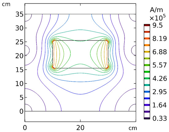 Maxwell–Ampere’s law was used to correlate the magnetic field and the current intensity based on the magneto-static nature of the problem (Equation (5)). Moreover, Gauss’s law (Equation (6)) was used to describe the magnetic flux density [18,30]: