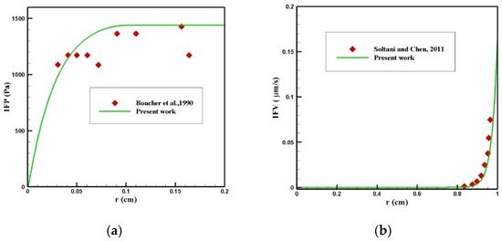 Finding the IFP and IFV is one of the exigent steps of this modeling, which was obtained by solving Equation (1). To validate the distribution of IFP in the tumor, a comparison between the radial distribution of IFP with an experimental work by Boucher et al. [52] was conducted under the same conditions, which is presented in Figure 23a. As can be seen in this figure, there was a good agreement between the values obtained from the modeling and the experimental results. In addition, the values of IFV distribution along the tumor radius were compared with the theoretical values presented by Soltani and Chen [42] (Figure 23b), and there was good agreement between the values of these two graphs.