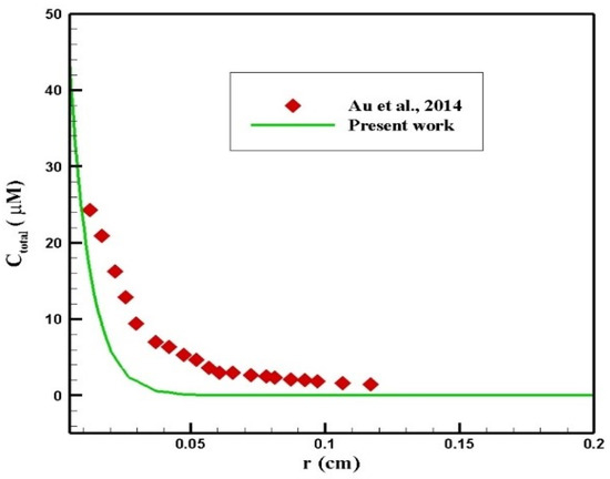 Au et al. [50] evaluated the performance of chemotherapy by IP injection on a mouse. In their study, the radius of the tumor was 2 mm, and 45 mM of paclitaxel was injected intraperitoneally. A comparison of the concentration profiles in terms of penetration depth within 6 h after injection is presented in Figure 24. As can be seen, there was a relatively good agreement between the two profiles. The difference between the concentration values in the two graphs resulted from different properties of the tissue and the drug in the two studies.