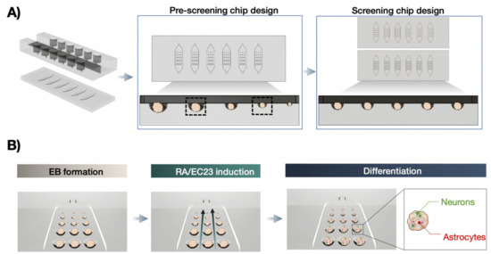 (A) Microfluidic biochip array concepts using a pre-screening chip design of multiple cavity sizes for embryoid body (EB) size optimization and two screening chip designs consisting of a single microcavity size on each individual chip. (B) Workflow of on-chip differentiation protocol including EB formation, exposure with neuralizing inducers retinoic acid (RA) or EC23, followed by differentiation in neurons and astrocytes. Created with BioRender.com.