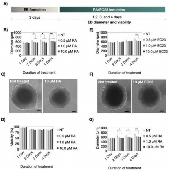 Although the Vitamin A derivatives RA and EC23 are commonly used for triggering stem cell differentiation to a neuronal phenotype [], elevated levels of both molecules are known to induce neurotoxic effects [,]. Consequently, as indicated in Figure 2A, an initial cultivation optimization study was performed to evaluate the dose-dependent effects of RA and EC23 on embryoid body viabilities. Potential cytotoxicity for increasing concentrations of RA and EC23 (e.g., 0.5, 1.0, and 10.0 µM) was measured by comparing P19 embryoid body morphology and viability over a cultivation period of up to four days of induction. Results shown in Figure 2B–D revealed stable embryoid body diameters independent of the RA concentration throughout the entire four days of induction. Time-dependent embryoid body diameters are shown in Figure 2B,C yielded initial values of 540.7 ± 11.7 µm, 558.1 ± 8.6 µm, and 546.4 ± 0.5 µm at day 1, and 631.4 ± 10.7 µm, 619.8 ± 15.8 µm, and 595.6 ± 15.0 µm at day 4, respectively. In contrast, untreated embryoid body sizes increased by 30% over four days resulting in maximum diameter of 734.1 ± 33.6 µm. Next, embryoid viabilities are closely monitored during a four-day induction period to exclude cytotoxic events caused by RA treatments that may reduce embryoid body diameter. As shown in Figure 2D, no cytotoxic effects of RA (up to 10.0 µM RA) were detectable. All treated and untreated embryoid bodies exhibited comparable viability values in the range of 82–98%. This result is in line with previous observations and points at a significant reduction in the proliferation capacity of embryonic stem cells when transitioning from a proliferative to a cell-differentiation stage []. Interestingly, a reduced dose-dependent size effect was found in EC23 treated embryoid bodies, thus pointing at a limited induction capacity. Figure 2E,F reveals no significant differences between treated and untreated embryoid bodies until day 4 of induction. Similarly, EC23 treatment (up to 10.0 µM) did not induce any significant cytotoxic effects on embryoid body viability over a treatment period of 4 days. Results in Figure 2G show average cell viability in the range of 79–96% between treated and untreated samples.