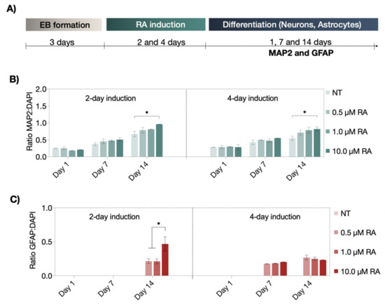 (A) Schematic workflow of the neural differentiation protocol of RA-induced neuronal and astrocytic differentiation. (B,C) Time-resolved expression of neuronal (MAP2; green fluorescence) and astrocytic (GFAP; red fluorescence) differentiation markers after two- and four-day treatment with concentrations of non-treated (NT), 0.5 µM, 1.0 µM, and 10 µM of RA under static cultivation condition. Statistical significance was tested by using one-way ANOVA (* p < 0.05), n = 2 ± SD. Bars without * do not represent statistical significance.