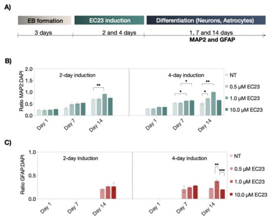 (A) Schematic representation of the neural differentiation protocol of EC23-induced neuronal and astrocytic differentiation. (B,C) Time-resolved expression of neuronal (MAP2; green) and astrocytic (GFAP; red) differentiation markers after two- and four-day treatment with concentrations of non-treated (NT), 0.5 µM, 1.0 µM, and 10 µM of EC23 under static cultivation condition. Statistical significance was tested by using one-way ANOVA (* p < 0.05, ** p < 0.01, and *** p < 0.001), n = 2 ± SD. Bars without * do not represent statistical significance.