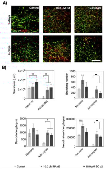 Next, neural morphometric parameters including network area, degree of branching, process length, and overall network length were investigated for both inducers. Figure 5 shows the results for RA and EC23 at the highest concentrations of 10 µM. For instance, fluorescence images shown in Figure 5A confirmed that both the induction period and the inducer type influence neuronal and astrocytic network morphologies of P19-derived embryoid bodies. Initial comparison between the two-day induction protocols revealed that the neuronal area was significantly improved for EC23 (p < 0.01) but not for RA, while astrocytes responded similarly for both inducers (p < 0.01). Additionally, neuronal branching was improved significantly in the presence of RA (p < 0.0021), and both treatment strategies improved astrocytic branching compared to the untreated control embryoid bodies (p < 0.01). Moreover, process length was significantly increased only for astrocytes and not neurons (p < 0.05). Furthermore, neural network length was significantly pronounced for neurons when embryoid bodies were treated with RA p < 0.001). A similar comparative analysis between neural morphology parameters of embryoid bodies is shown in Figure S2 and revealed that both inducers improved astrocytic parameters alike. For instance, a 126- and 128-fold increase of astrocytic network area, 331- and 300-fold increase of astrocyte branching, 2.1- and 2.8-fold increase of astrocytic process length was found, as well as an overall improvement of 130-fold of total astrocytic network length (longest interconnected path) for both 10 µM RA and EC23, respectively. Overall, these results indicate that higher concentrations of 10 µM RA and EC23 tend to improve neuronal differentiation, whereas elongation of the induction period stimulates especially astrocytic differentiation in P19 embryoid bodies.